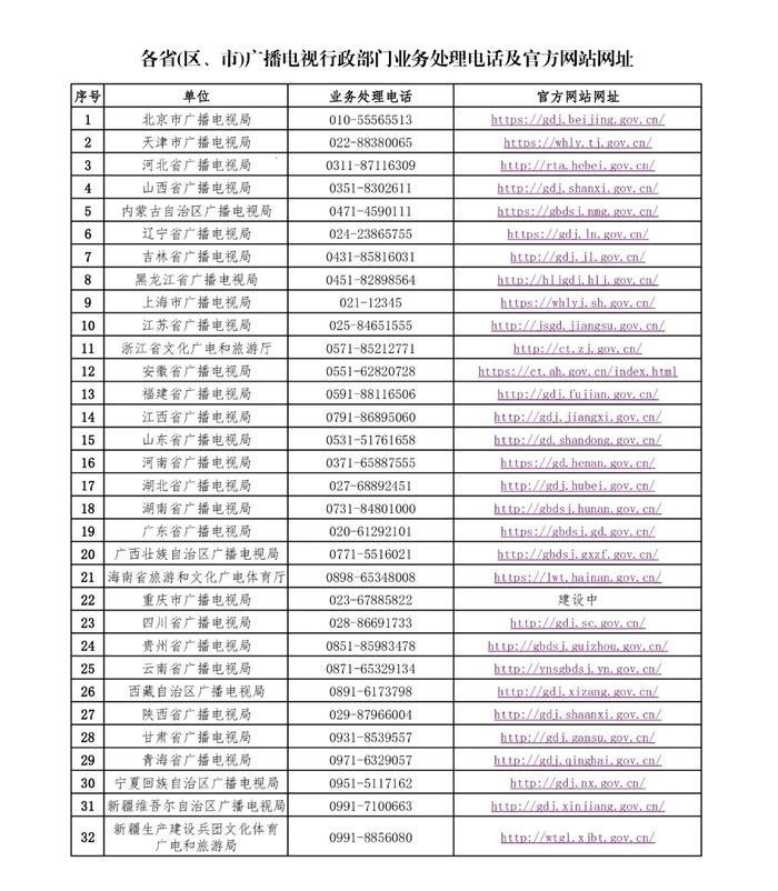 1.所在省(区、市)广播电视行政部门业务处理电话,以及官方网站等线上渠道(见附表);