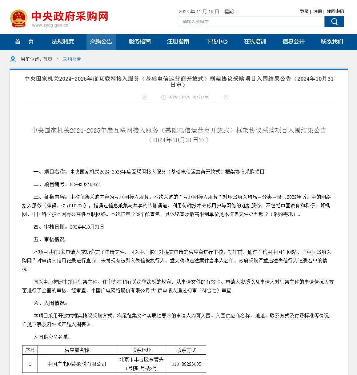 近日,经央采中心评审委员会评定,确认中国广电网络股份有限公司入围中央国家机关2024—2025年度互联网接入服务(基础电信运营商开放式)框架协议采购项目(项目编号:GC—HGD240932)。