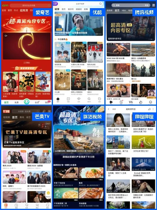 爱奇艺、优酷、腾讯视频、芒果TV、咪咕视频、哔哩哔哩超高清专区