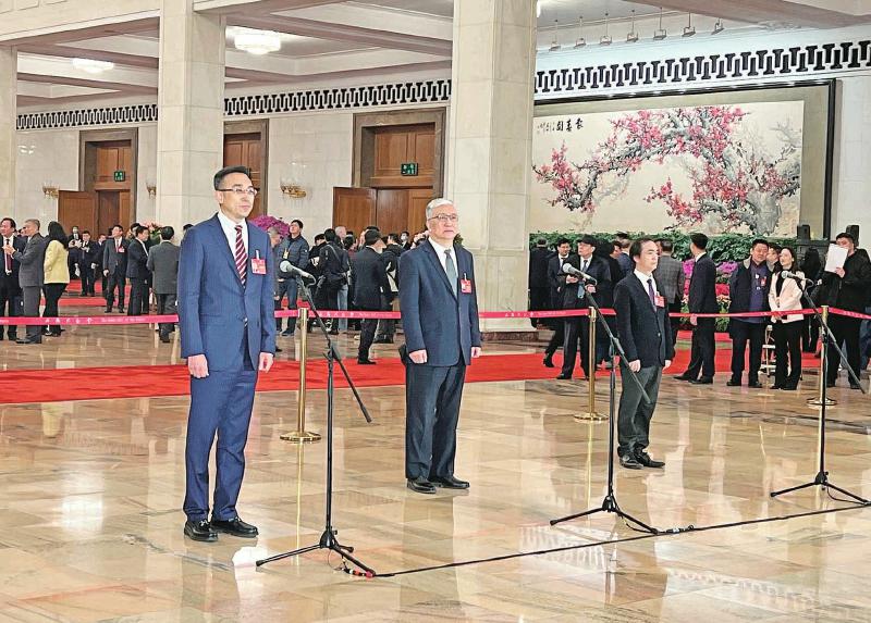 3月7日上午,全国政协十四届二次会议举行第二场“委员通道”集体采访。全国政协委员、北京希肯国际文化集团董事长安庭(左一)分享了排练话剧《上甘岭》时台前幕后的故事:“有太多的时代英雄、时代楷模成了我们今天舞台上的英雄形象。我们要创作出更多更好的作品来歌颂他们。”